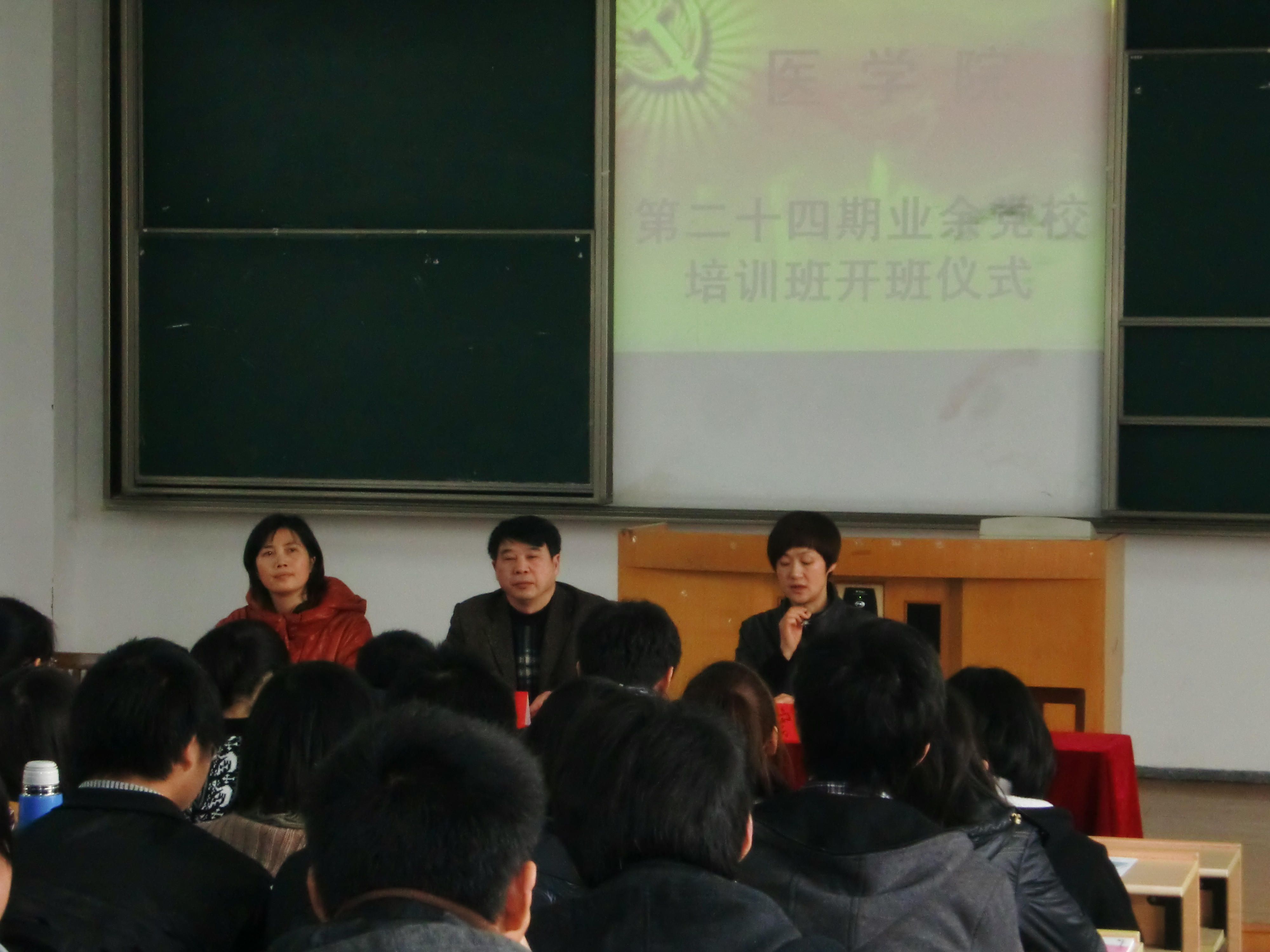 开班典礼在雄壮的国歌声中开始。首先,谢宏副书记宣读了第23期业余党校优秀学员名单并给予表彰。随后,医本102班闻建锋同学作为本期党校学员代表发言,承诺将严格遵守党校学员管理规定,积极参加党组织的各项活动,将以最饱满的热情来完成党课学习。张书记围绕“参加业余党校的重要性”和“怎样参加业余党校”两个方面作了深刻的讲话,同时希望学员们明确学习的重点,珍惜学习机会,能学以致用,具体落实到行动上,最后,他预祝第24期业余党校学院能圆满完成学业,顺利结业。