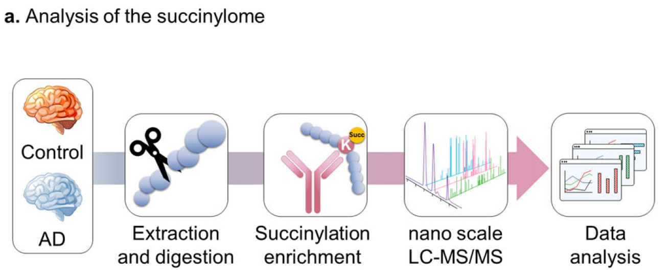 本项研究中,研究团队首次利用琥珀酰化修饰组学,同时结合蛋白质组学,系统地研究了AD患者脑组织中蛋白质琥珀酰化修饰水平的变化,发现了AD关键蛋白tau和APP可以发生琥珀酰化修饰,并在AD小鼠模型中,动态观察了两种蛋白的琥珀酰化修饰水平与AD疾病进展的内在联系。琥珀酰化将线粒体功能障碍与淀粉样变性和 tau 病变联系起来的发现可能提供新的分子诊断方法以及潜在的治疗靶点。通过表观蛋白组学,为描绘AD发病机制研究提供了非常有价值的线索和依据,同时引入了新的见解和思路。