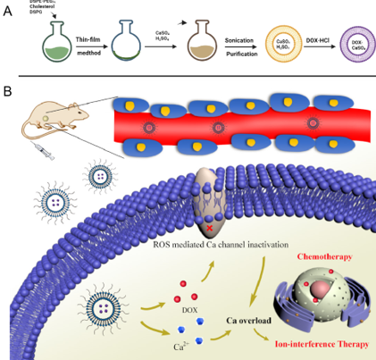 图1.(A)利用硫酸钙梯度法合成LipoCa-DOX纳米颗粒;(B)LipoCa-DOX纳米颗粒用于