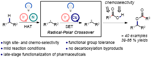 该研究发展了一种可见光/铜共催化的苄基碳氢键酯化方法。这种方法通过光催化的氢原子转移和铜(II)催化的自由基-极性交叉相结合,可以以中等至优异的产率合成苄基酯,具有很高的区域选择性和化学选择性。值得注意的是,方法中仅需要化学计量级的羧酸用作底物,可以用于合成结构多样的苄基酯和药物的后期功能化,进一步推动药物研发进程。