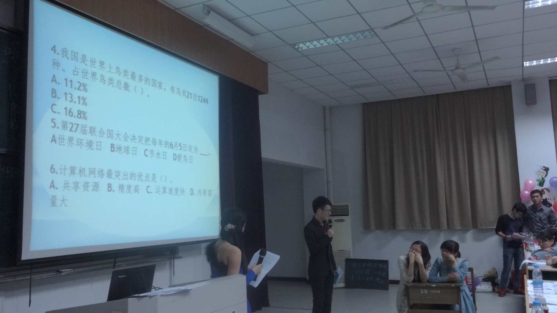 一首乐感十足的开场曲拉开了本次知识竞赛决赛的序幕。本次比赛的规则是五支队伍轮流答题,初赛晋级的四支队伍将根据抽签顺序进行答题,最后一支复活队则作为挑战队,对前四支队伍发起冲击,进行决赛大奖的最后争夺。同时每支队伍还有三次机会得到智囊团提供的场外援助。比赛前,每支队伍进行参赛宣言,他们都对即将开始的竞赛跃跃欲试。之后,播放了每支队伍的VCR,队员们精心准备的自我介绍风趣幽默,又不乏实力展现,亲友团的加油助威更是引得现场笑声阵阵。