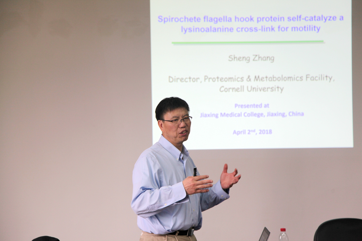 教师作了《Spirochaete flagella hook proteins self-catalyse a lysinoalanine covalent cross for motility》的学术报告。报告展示了张胜团队在康奈尔大学开展的当今世界前沿的蛋白绞联技术和蛋白互作技术的进展和应用,令教师受益匪浅。