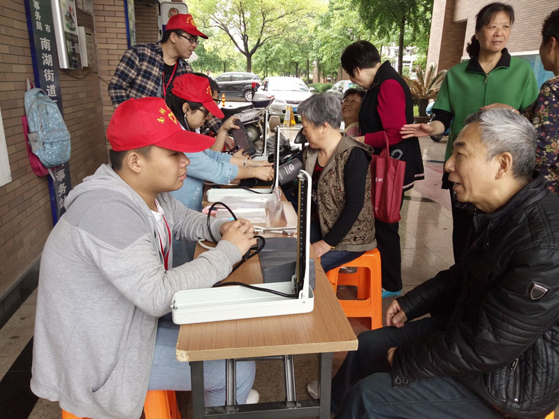 青协成员们分工明确,配合默契,整个活动顺利进行着。专业负责的成员们会建议匆匆赶来量血压的老年人稍作休息后再开始量血压。当有些老年人测得的血压高时,成员们会询问他们的高血压龄,建议他们坚持吃药,稳定血压,要多多注重饮食健康,饭后散步,少吃盐,少吃油腻食品等。活动中,成员们还向居民们介绍了日常的急救自救知识,以便在危难发生之时采取正确的急救措施。