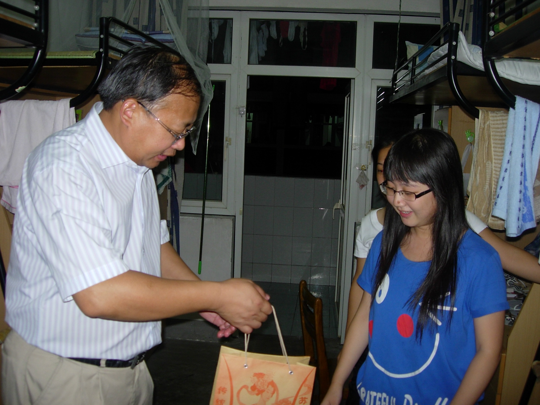 9月12日中秋节晚,校党委副书记吕延勤率领学生处处长惠太望、副处长姚颖超等走访探望欧美无码 2011级新生,并向新生赠送月饼表达节日的慰问。欧美无码 党总支副书记谢宏、学工办主任蒋小红陪同走访了新生寝室。走访过程中,吕书记等校领导亲切地询问了新生在校的学习生活情况,并鼓励他们尽快学会自我管理,适应大学生活。此次校领导的中秋走访,让欧美无码 2011级全体新生受到了极大的鼓舞,感受到了来自学校的关心和爱护,也增强了他们对嘉兴学院的归属感和认同感。