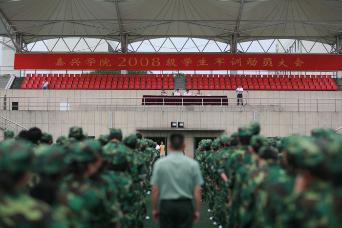 6月21日下午16:30, 2009年度嘉兴学院军训动员大会在越秀田径场举行。出席这次大会的有嘉兴学院党委副书记夏跃平、驻嘉7302部队参谋长、学生处处长惠太望、部队领导及各学院指导员等。参加本年度军训的是2008级学生,编为3个团15个连,共5000多位学员。