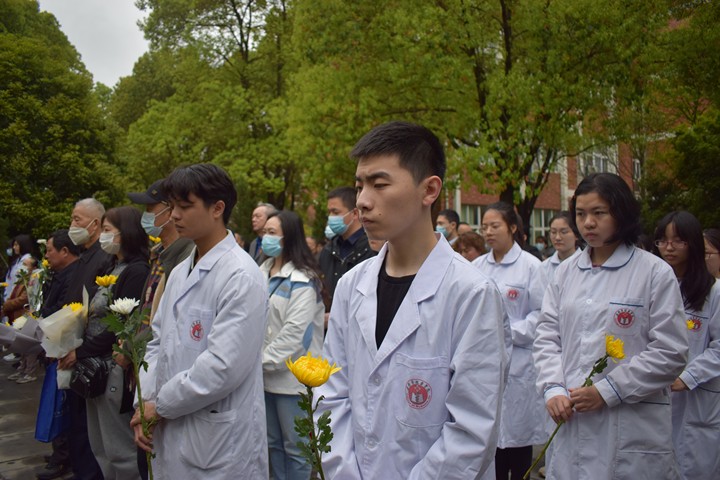 “无语良师”,也称“人体老师”,是医学界对志愿捐献遗体者的最高称谓。活动开始,全体医学生站在无语良师碑前,向心怀大爱的“无语良师”致以最深沉的悼念。大家手捧黄白菊花,怀着感恩之心向“无语良师”行三鞠躬;学生代表为“无语良师”献上花篮,对他们表示深切怀念和感恩。随后,全体人员将手中的菊花放在石碑周围,以敬畏之心瞻仰“无语良师”纪念碑。仪式最后,全体医学生还重温了医学生誓言,以此表达“除人类之病痛,助健康之完美”的初心。