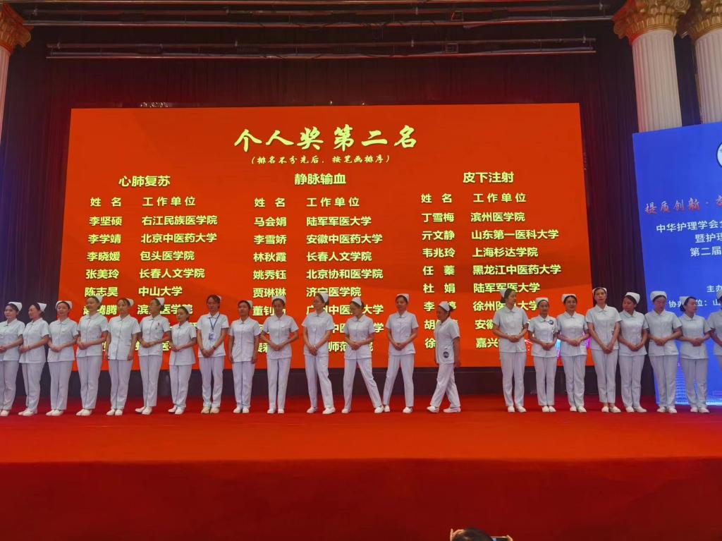 护理系徐鋆娴老师、雷璇老师,附属医院张凤萍老师组成的代表队获个人单项奖第一名1项、第二名1项,团队获第二名。
