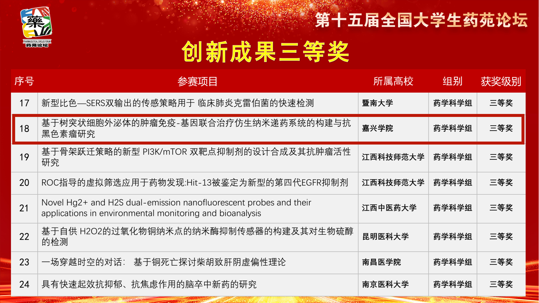 欧美无码 药学专业20级张飞琴同学团队(指导老师:张洁、丁宝月)完成的研究成果《基于树突状细胞外泌体的肿瘤免疫-基因联合治疗仿生纳米递药系统的构建与抗黑色素瘤研究》,荣获“创新成果三等奖”。