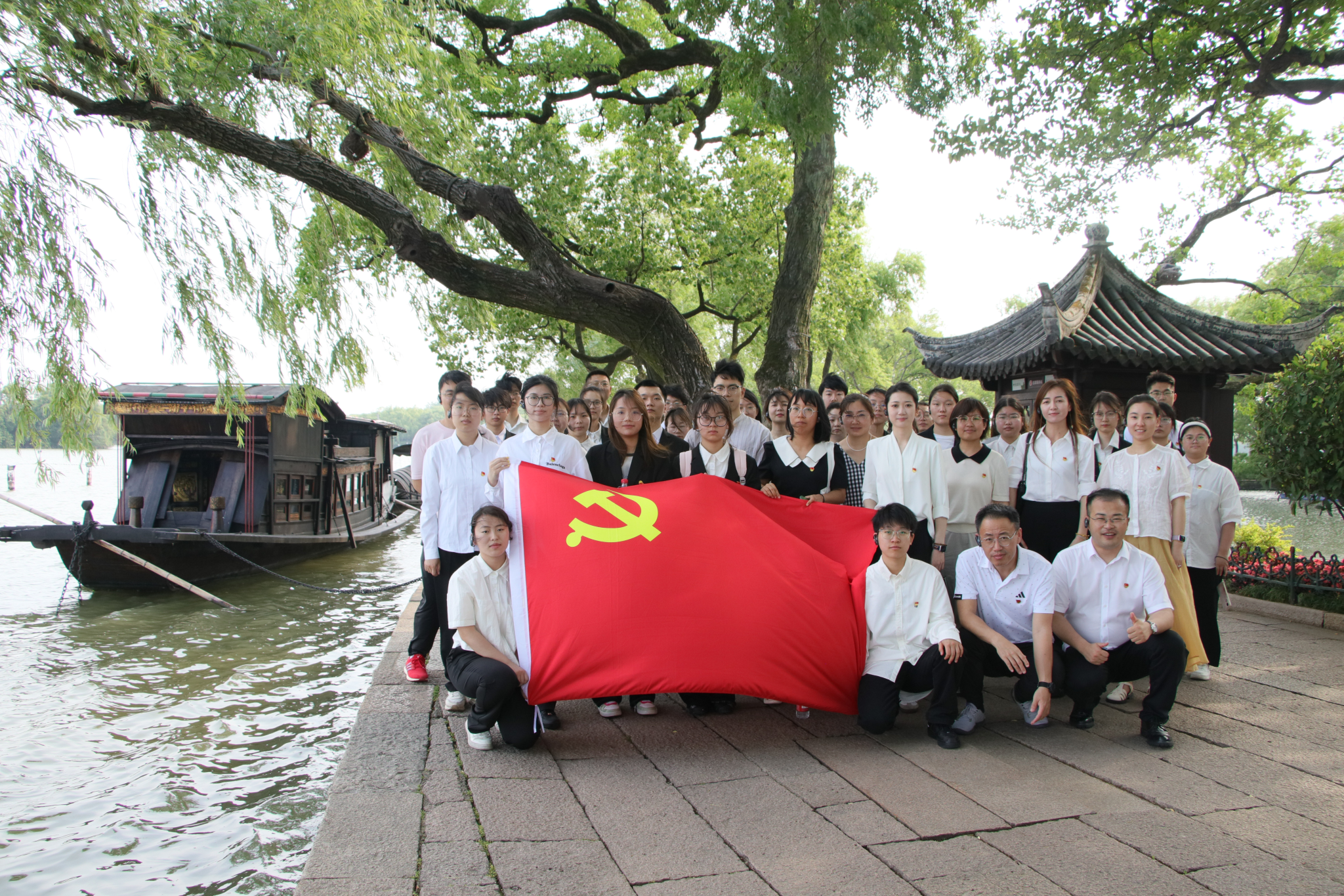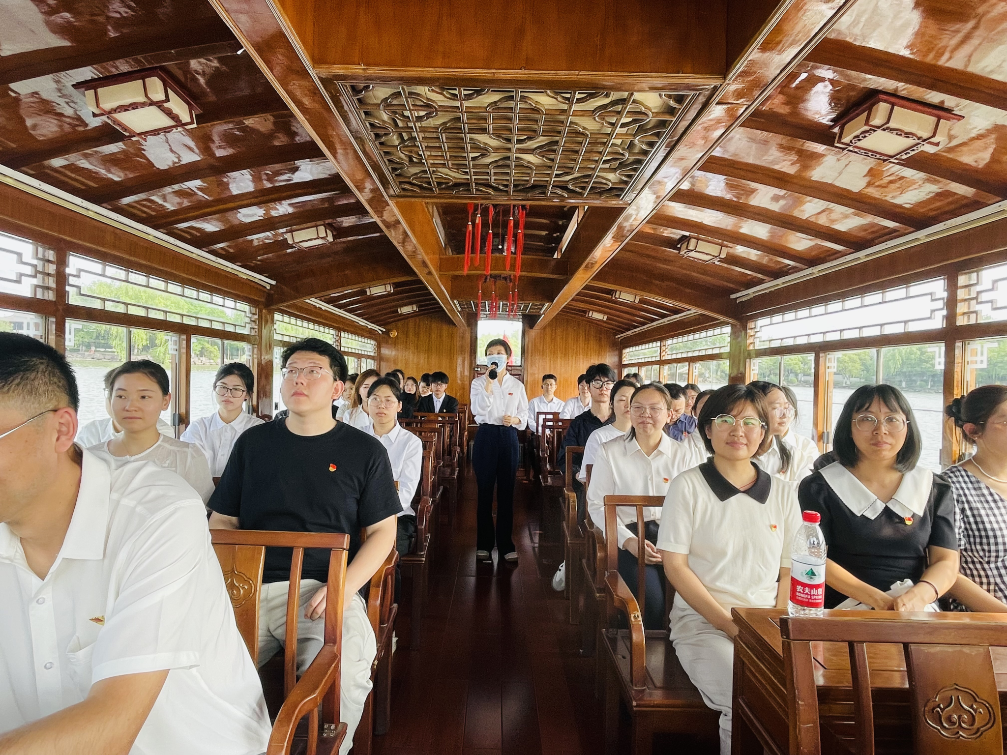 宣誓完毕后,师生党员们乘船登岛。在前往湖心岛的画舫上,党员们聆听了一场别开生面的水上党课“一条小船和一个大党的故事”。授课老师生动讲述了中国共产党的建党历程、“一大”会议过程、“一大”代表们的人生轨迹,引导党员干部深思什么是坚定信仰,牢记传承“开天辟地、敢为人先的首创精神,坚定理想、百折不挠的奋斗精神,立党为公、忠诚为民的奉献精神”。