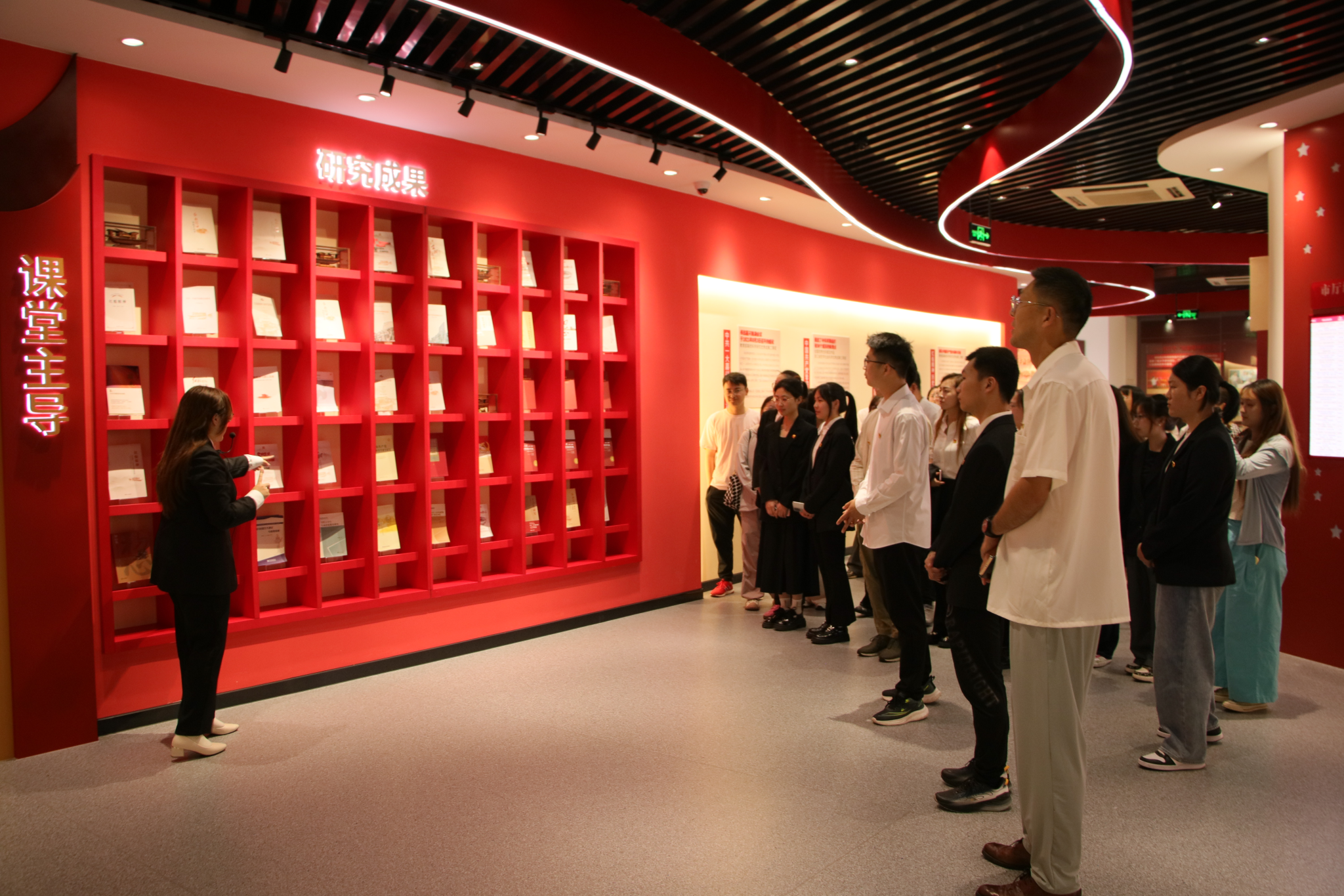 活动首站为学校红船精神育人成果展示馆。在讲解员的引导下,通过五个主题展厅,以丰富的史料、生动的案例,让师生党员们全面了解了学校在传承和弘扬红船精神、开展红色文化育人方面的丰富探索与生动实践。